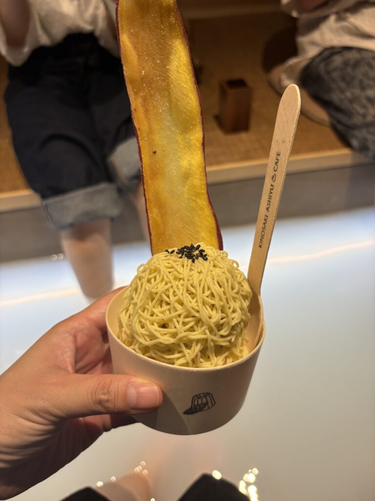 但馬牛のコロッケや肉まんなどを頬張り足湯しながらスイーツを食べ、お腹も心も満たされました。
