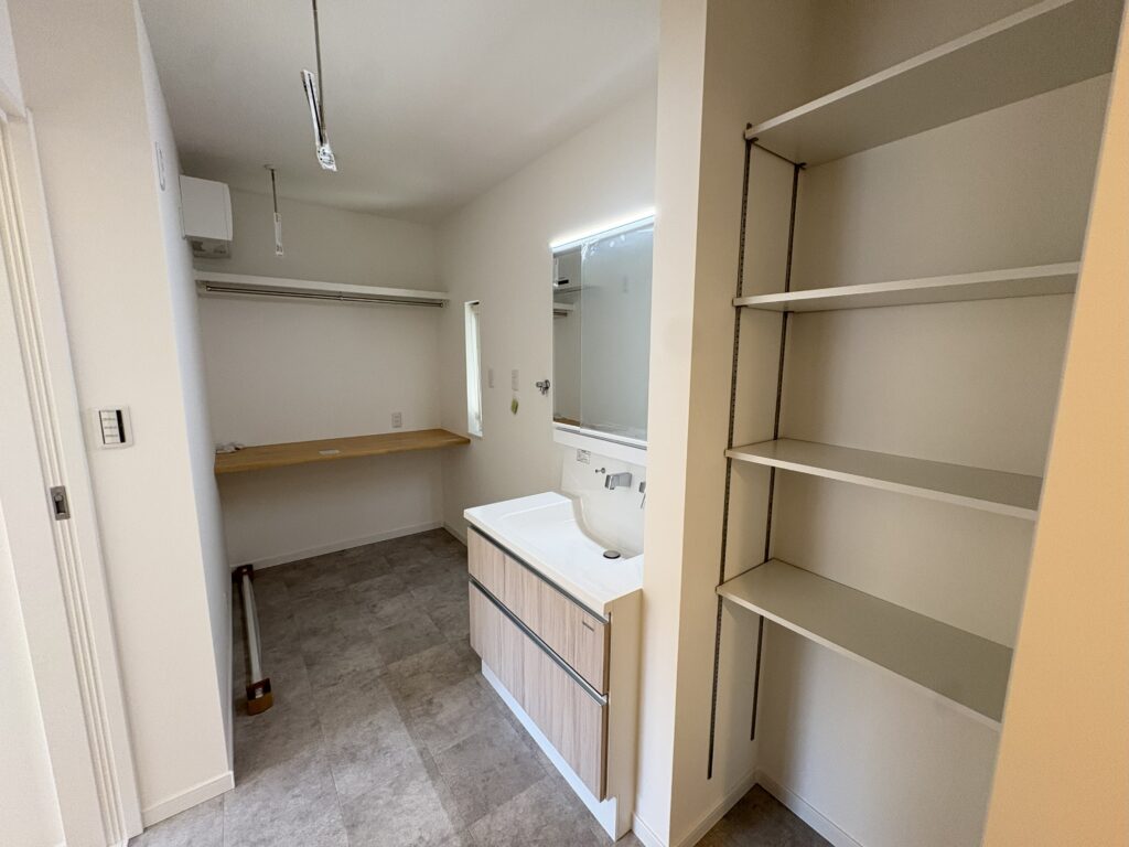 とても広々とした洗面室には可動棚に造作カウンター、ハンガーパイプが取り付けられていました。