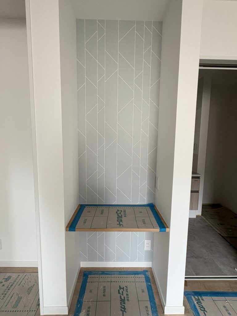 リビングの真ん中にアクセントクロスが貼られた凹んだスペースがありました。