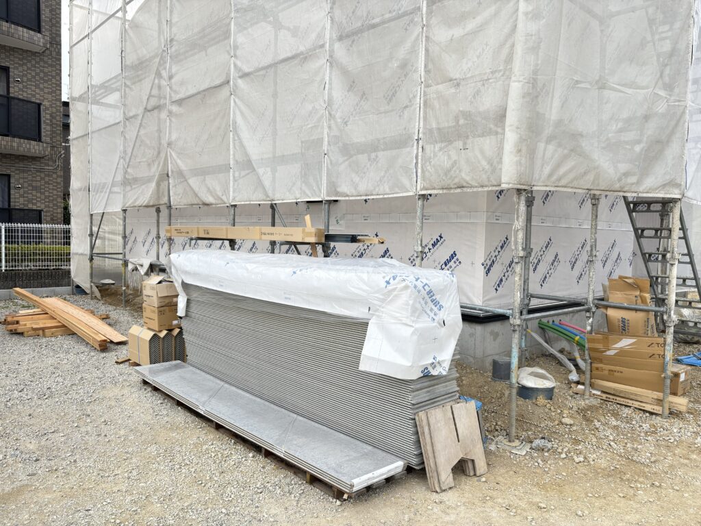 外壁の施工が順調に進んでおり、白いシートが貼られていました!